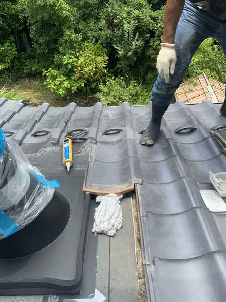 水切りシートを貼り付けていきます。瓦屋根を一部切欠きしてよりスムーズに