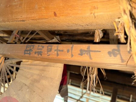 別件で小屋裏にのぼる機会あったので、棟木に飾られた御幣を確認。