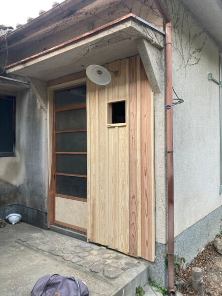 アルミの引違い戸と枠回りを撤去。半分を杉板壁として、もう半分を