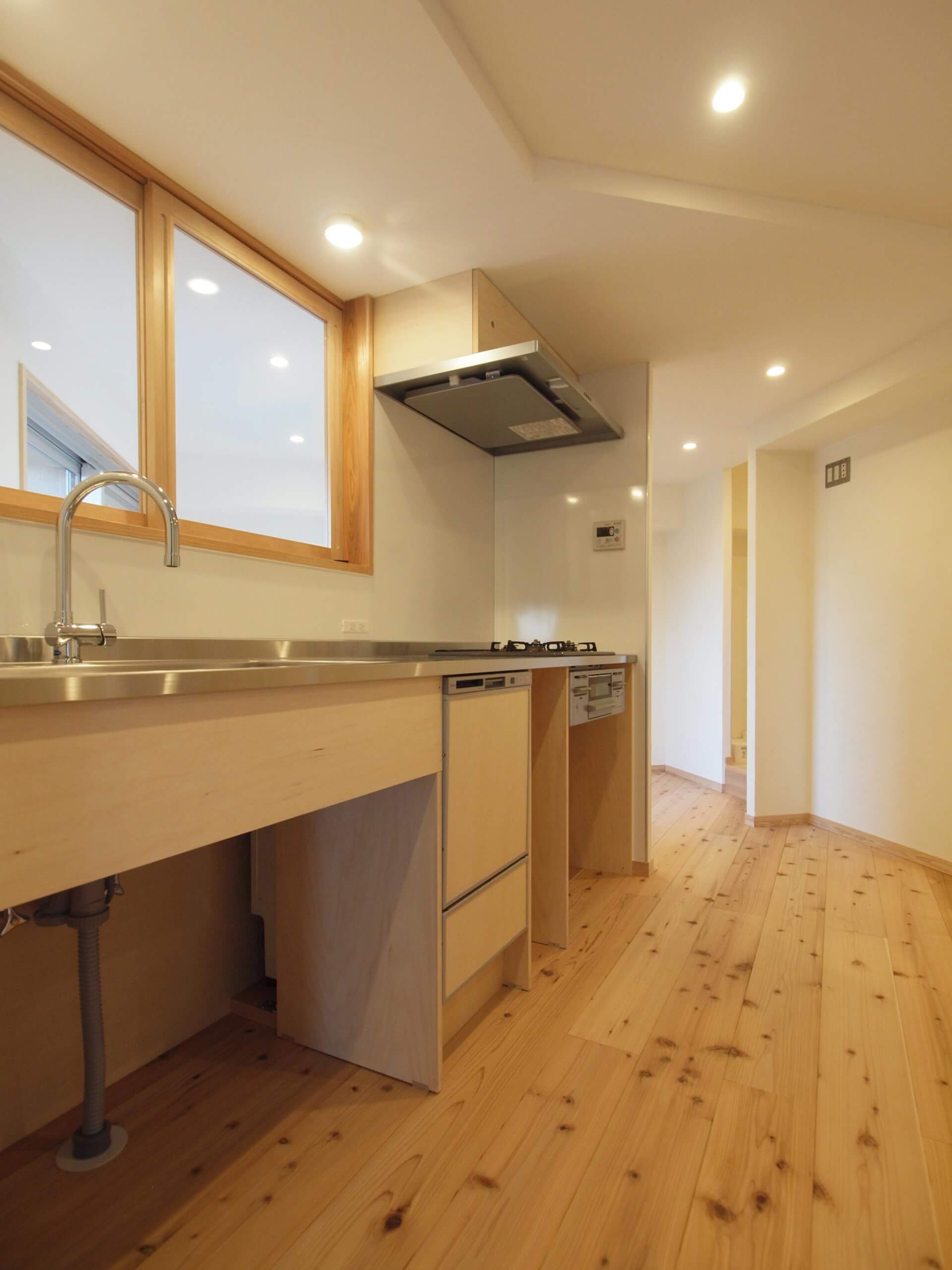 ●通風・動線をシンプルに取り込み、水回りを通風経路上 に配置する事で湿気・熱気が籠もらない快適なキッチン・浴室に。 天井高さをぐっと抑えた、羽目板張りのダイニングスペースも 落ち着いた空間。
