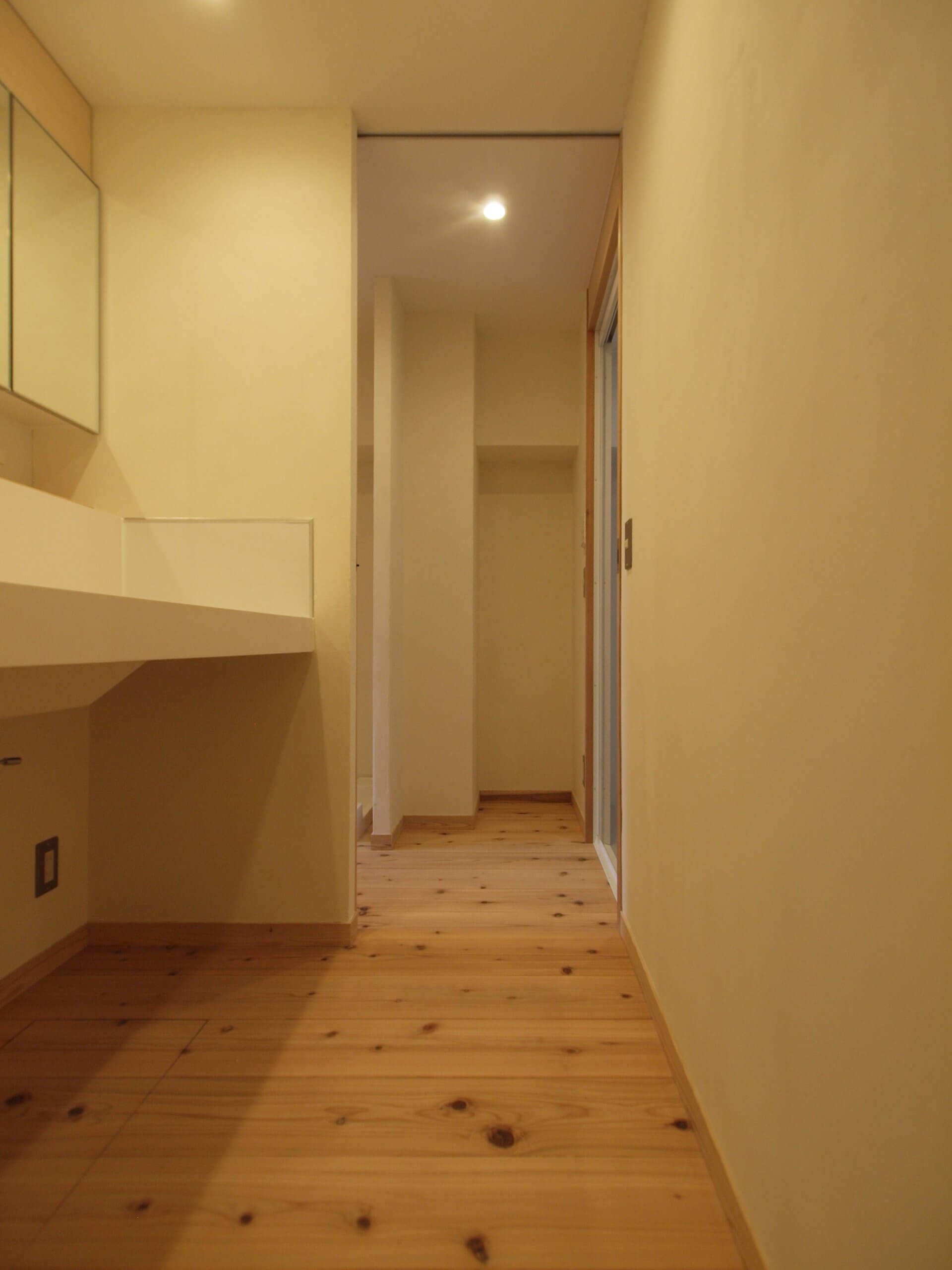 設計コメント:部屋数の確保を優先していた間取りのマンション住戸 を子育てファミリーが過ごしやすい大空間のある住戸に改修 を行いました。 子育てファミリー世帯のリノベーションを提案する際、施主さん のご要望をしっかりと把握・反映する事の他、大事にしているのが ”家族の変化(成長)”に対応出来る大空間にすることです。 ・お子さんが小さい間は、家族みんなで過ごせる空間を ・お子さんが成長したら、小さいながらもプライベート空間を ・お子さんが独立したら、夫婦ふたりでゆとりの大空間を ただただ間仕切り壁を撤去し、大きな空間を確保するだけでは なく、”引込み戸”や”可動式の小上がり”を間取り・動線上に組み込む 事で空間を大きく使ったり、小さく使ったり出来るような工夫を しています。 また、この住まいでは家事の中でも特に”洗濯→整理→収納”という 動きをブラッシュアップして、リノベーションプランに反映させて いき、住まい手さんらしい水回り空間に仕上がりました。 共働き・子育て世帯の方にリノベーションの参考にした欲しい部分です。