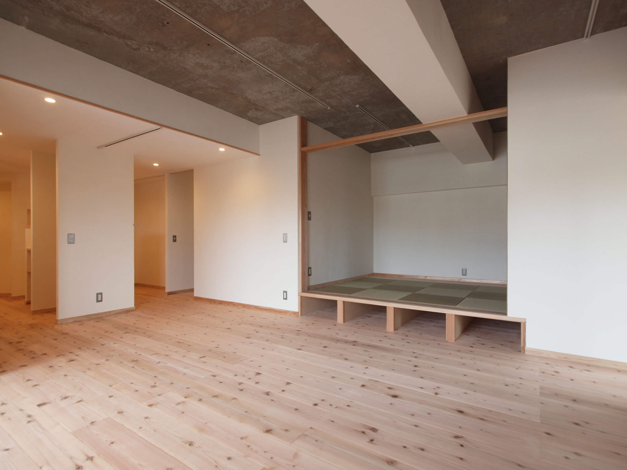 ●壁に引き込める建具や障子・動かせる小上がり家具などを用いる 事で住戸全体を有効にフレキシブルに使う事が出来る住まいです。 サワラ張りのハーフユニットバスはマンションとは思えない空間に。