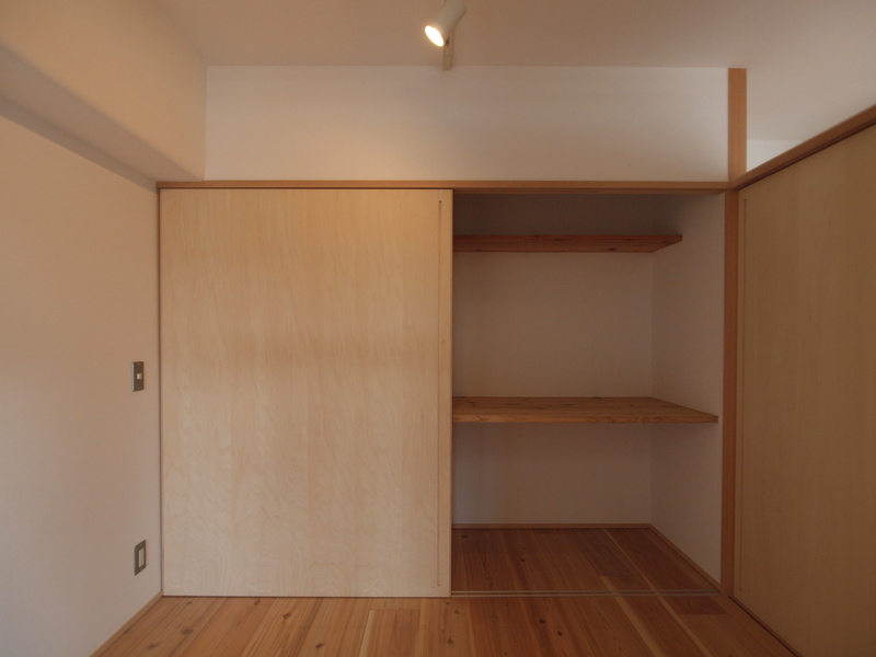 そこを出来るだけすっきりと見えるよう、梁下でラインを揃えて、木の枠材も極力細くしてもらっています。建具の素材は明るい印象のシナ(無塗装)に統一する事で全体と馴染むようにひと工夫しています。