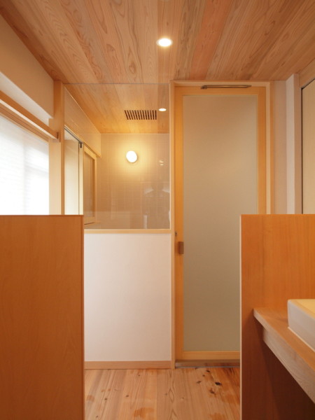浴室はTOTOのハーフユニットを用い、天井は杉羽目板、壁は100角タイル張りとしています。