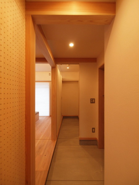 玄関空間には120mm角の杉材を用いて、迫力ある架構を組み、建具枠及び空間を仕切る役割を持たせる事で、マンション構造体の存在を感じないように工夫しています。