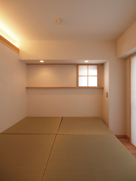 障子上部の梁ふかし空間の下面には、ユニバーサルダウンライト(照射角度を調整出来る照明器具)設け、就寝空間を演出しています。