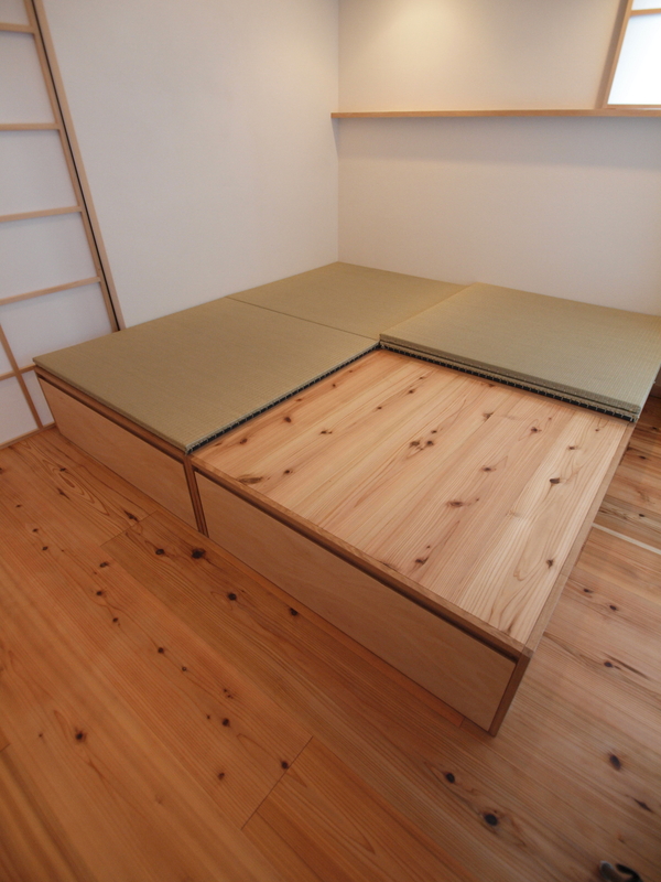 ユニットの天板は床と同じ杉フローリングで仕上げているので、畳を外して作業台として使う事も出来るようにしています。