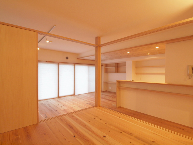 隅に杉の柱(戸当たり)は、LDKと多目的空間との柔らかな空間分けとして。