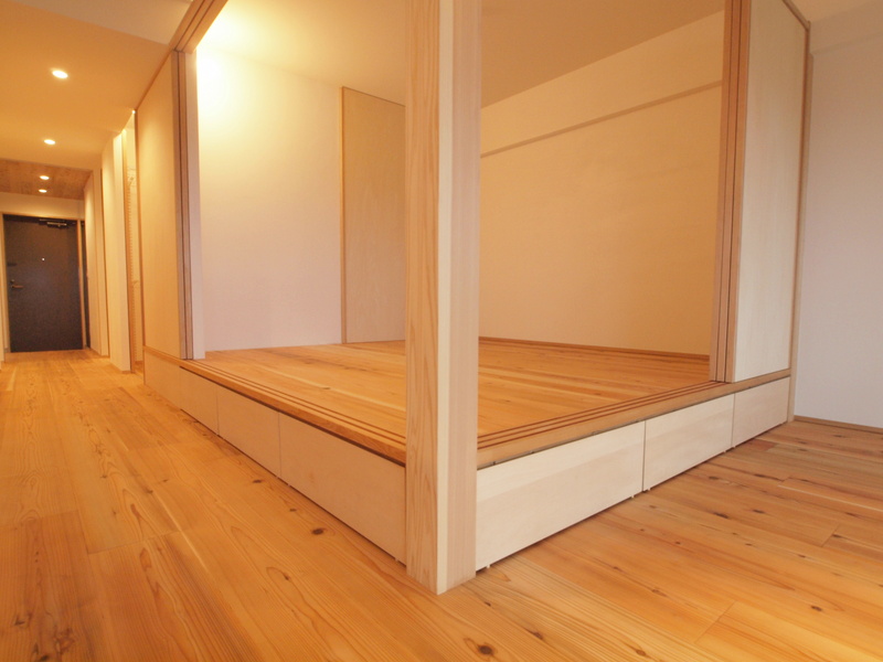 小上がり空間の床は”遮音二重床+小上がり床組”でコンクリートの躯体から45cmほど上がっており、季節物やアウトドア用品等の収納としても良し。