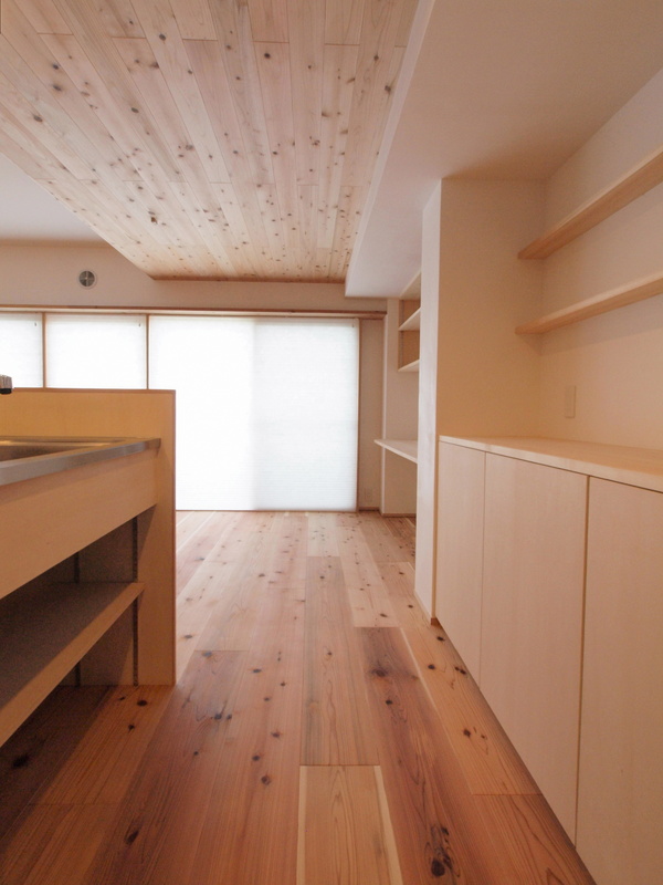 キッチン及びダイニングの天井高さを215cmに抑えつつ、天井面にを杉の羽目板張りとする事で、同じLDKの中にも異なる空間を感じられるように計画