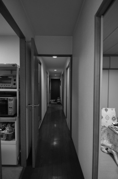 【暗がりとなった廊下と手狭な玄関空間】